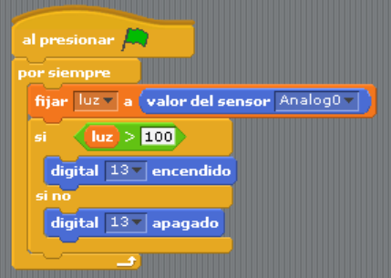 Crear un programa que permita encender el LED integrado (Pin 13) a través de un sensor LDR. De manera que, si el sensor recibe luz, el LED esté apagado, pero si el sensor deja de percibir luz, el LED se encienda.
